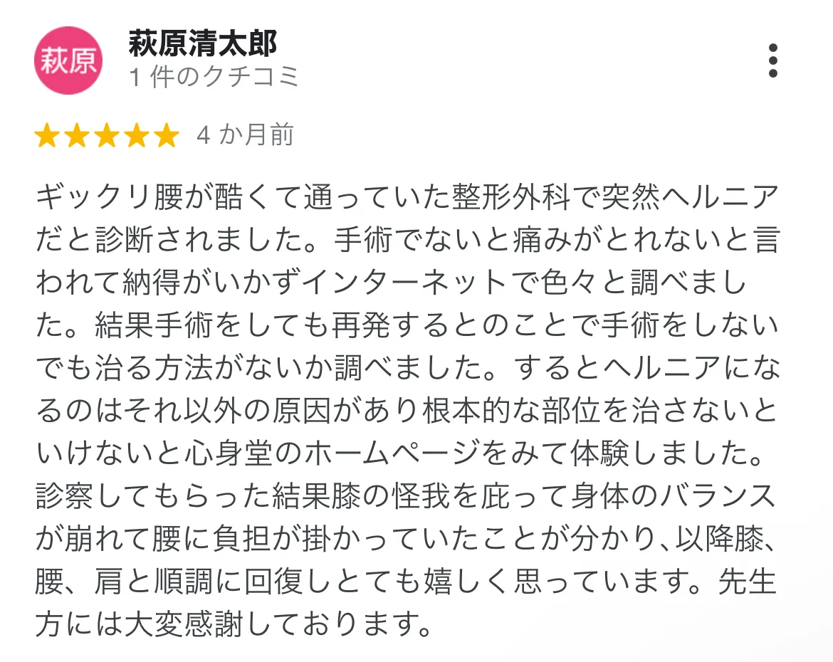 ヘルニアで他の整体院に行っていましたが、その場では痛みがひくものの、すぐに再発を繰り返していました。あくまで感覚ですが、心身堂さんは今まで行ったことのある治療院とは違う感じがしました。 実際に痛みは完全になくなり、再発の心配もなさそうです。本当にありがとうございました。