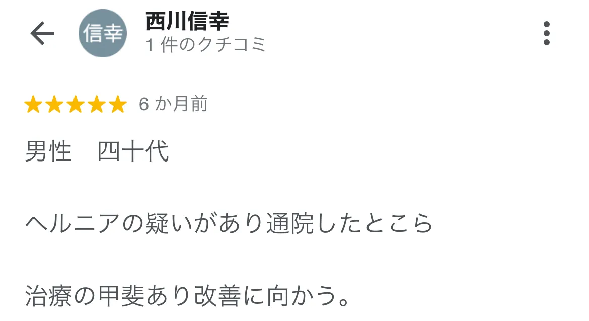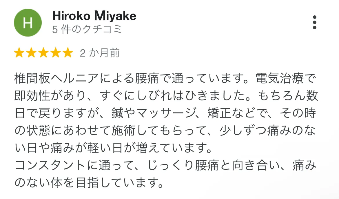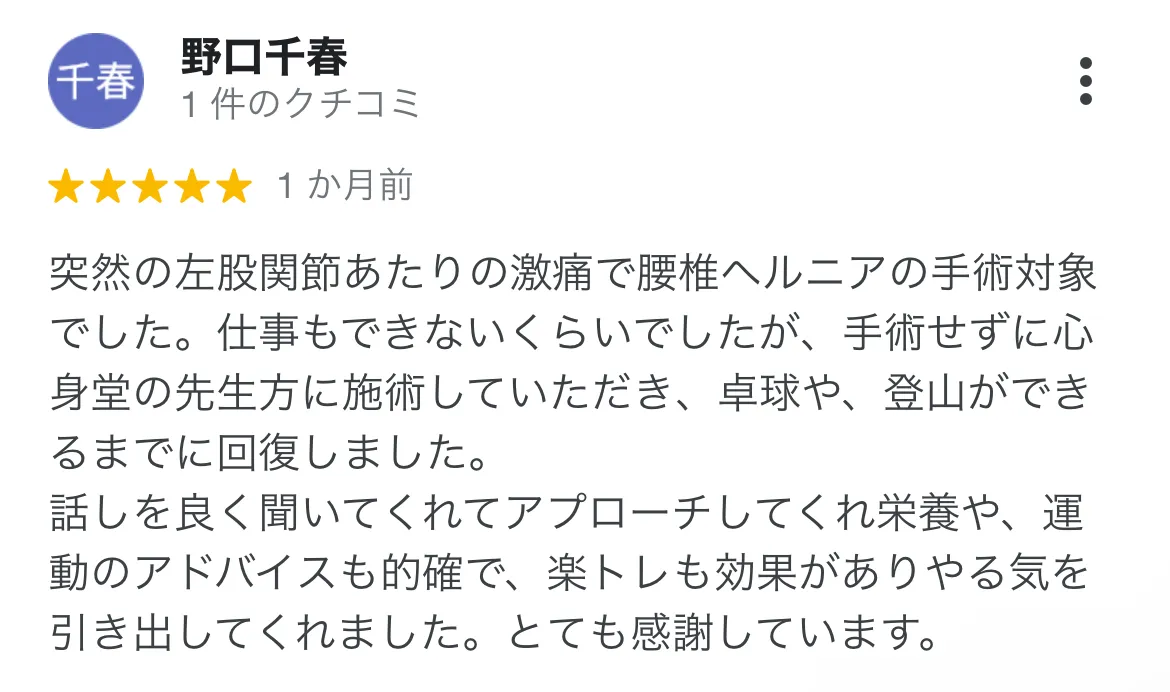 腰椎ヘルニアで整形外科に通っていましたが、薬を処方されるだけで痛み自体の改善は感じられずにいました。どうにかしたい想いで心身堂さんにお邪魔させていただき、本当に丁寧に原因、施術方針を教えてくださいました。 それからどんどん痛みは和らいでいき、今ではだいぶ楽になりました。原因をしっかり説明してくださるので、とても安心しておまかせできます。