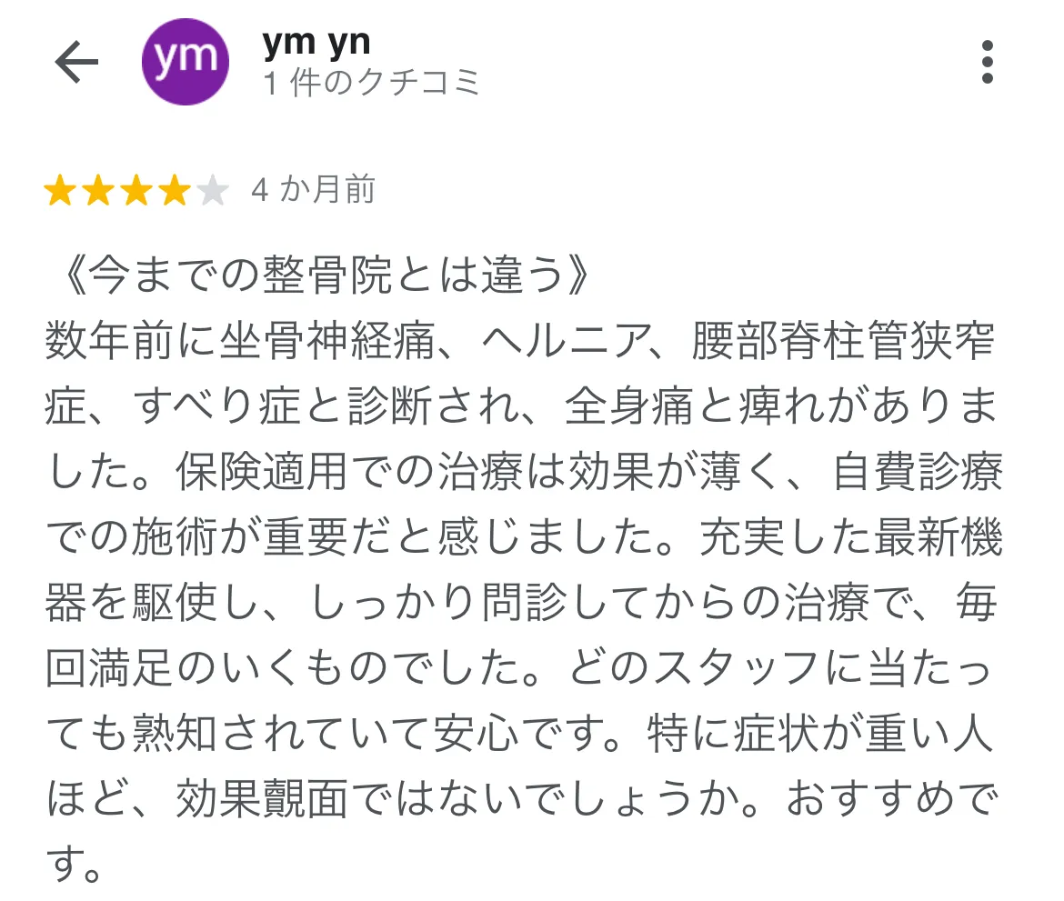 足の痛みや全身のしびれがあり、他の接骨院に通っていました。痛みが和らいだ感覚はありましたが、完治には至りませんでした。そんな中、心身堂さんを知り、伺ったところまさかのヘルニアとの診断…驚きました… それから原因に対して施術をしていただき、今では足の痛みも全身のしびれも気にせず生活を送れています!検査力、最新機器など治療院のイメージを覆されました。