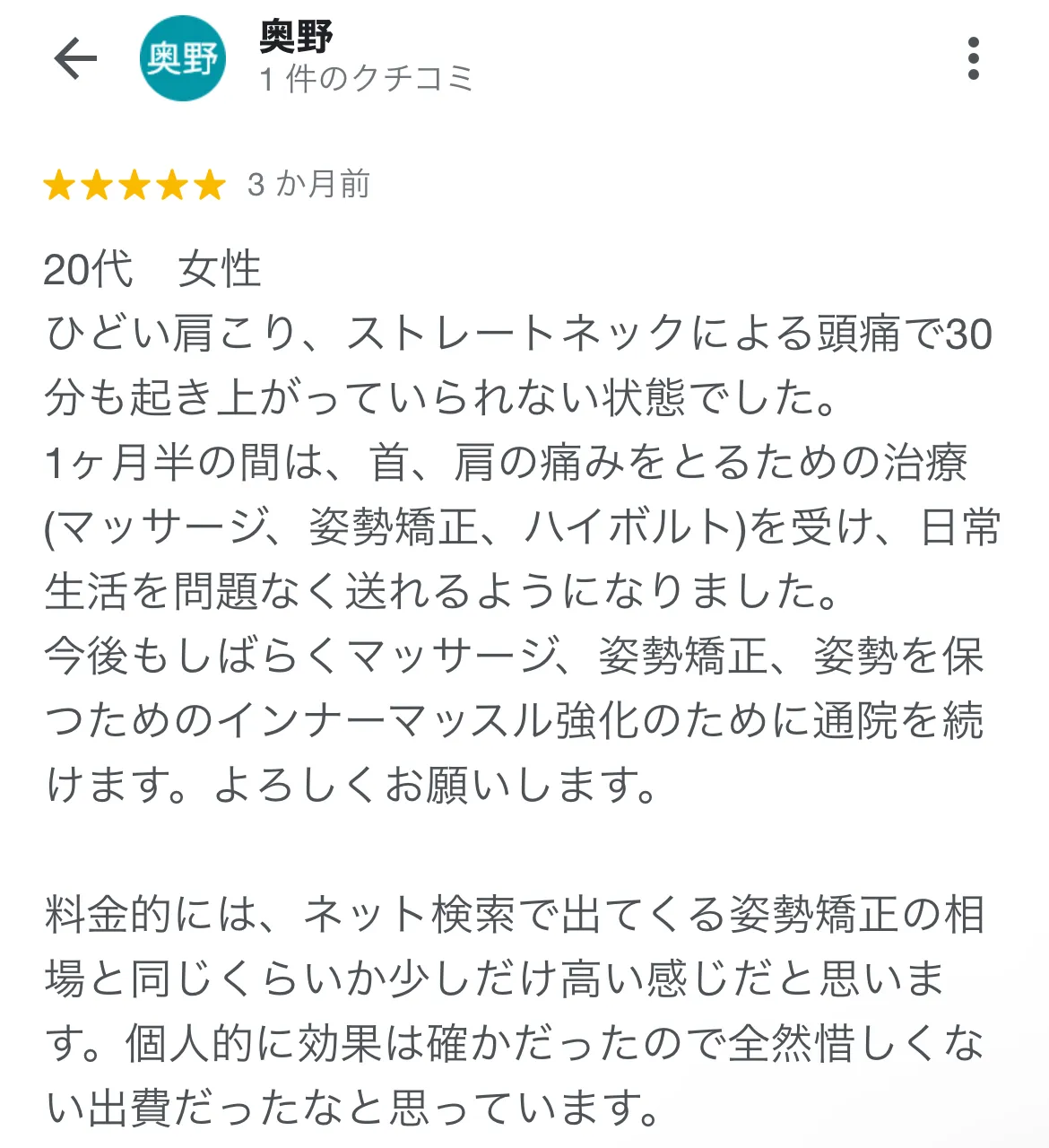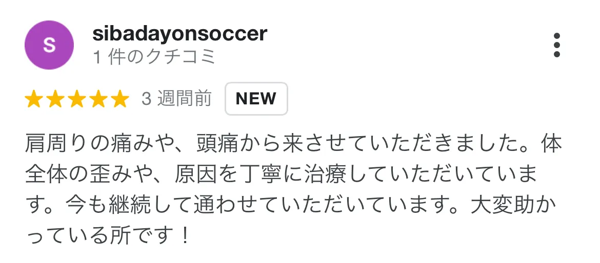 肩こりに悩まされていたので、心身堂さんに通院しました。入念な検査で原因を見つけてくださり、優しくわかりやすく説明していただけたので嬉しかったです。 症状もどんどん楽になっているので、今まで治らなかった痛みを抱えている方には安心してお勧めできます。