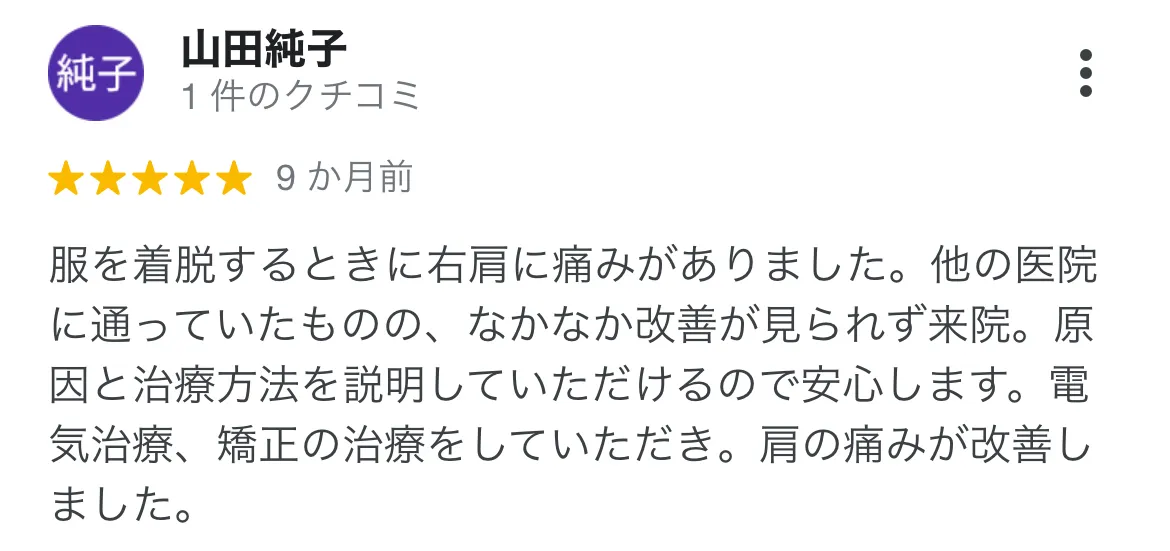 五十肩がひどく、整形外科に行っていました。薬の服用、コルセット着用をしていましたが、治らず… 心身堂さんでは、今まで治らなかったのが嘘のように着々と改善しています。何より先生方の対応がとても気持ちよく、楽しく通院できています!