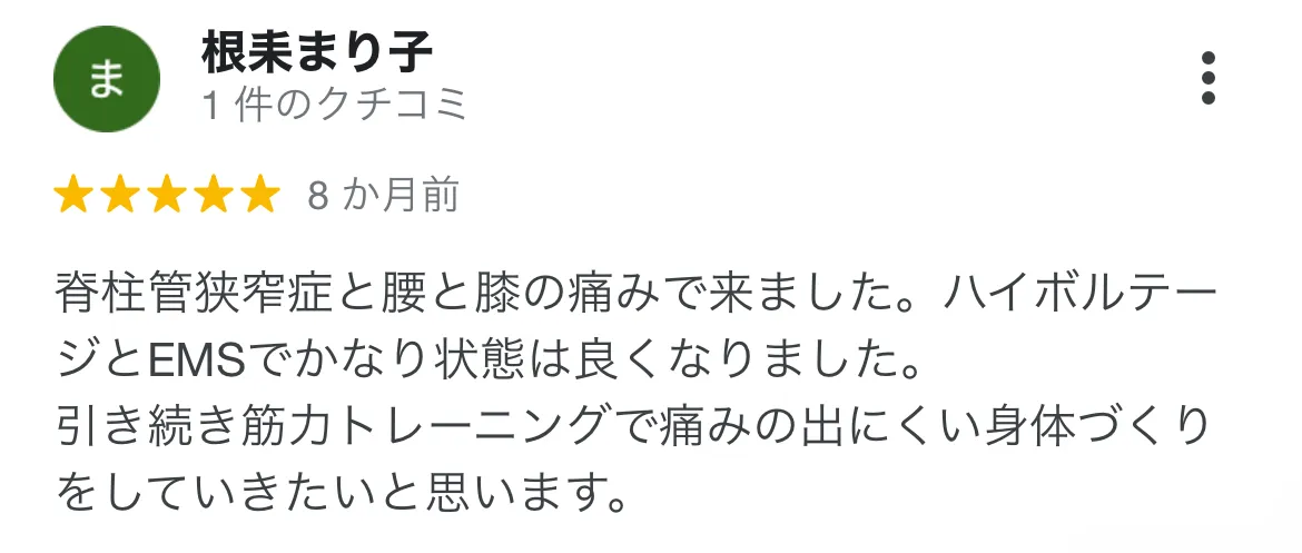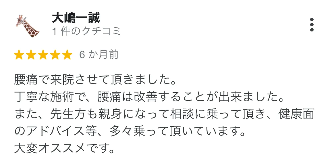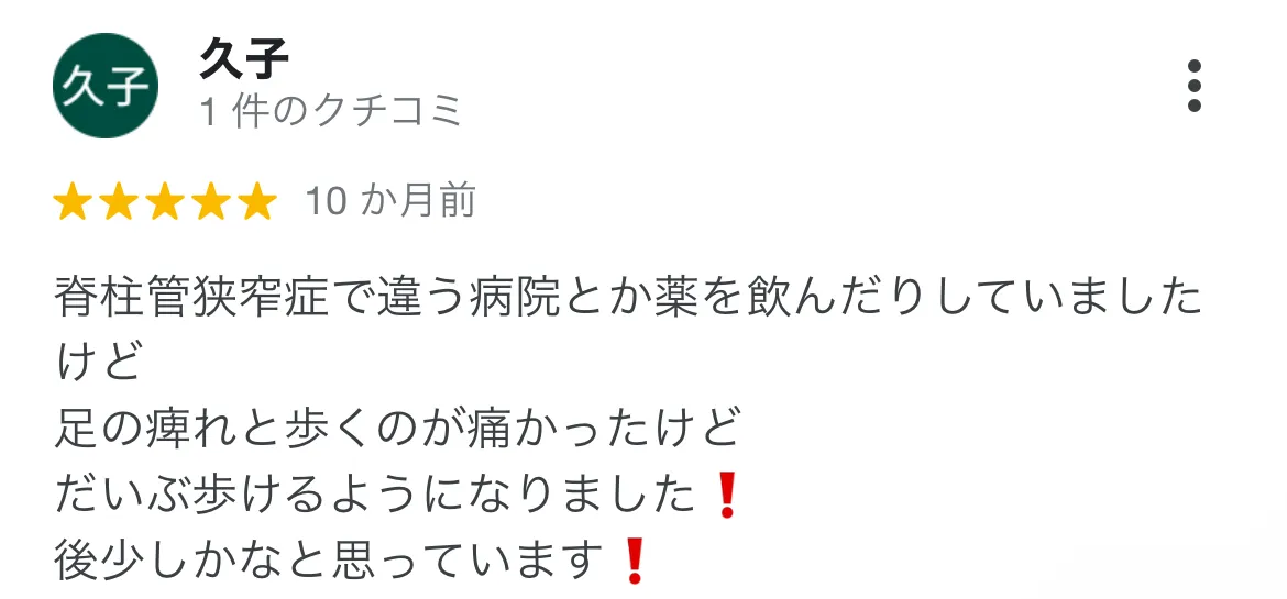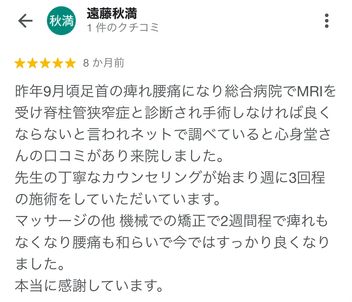 狭窄症による腰の痛みとしびれで病院に通って、安静にもしていましたが、なかなか治る兆しがありませんでした。心身堂さんはわかりやすく原因を説明してくださり、その原因に対してしっかりと施術してくださり完治しました。先生もやさしくおすすめです!