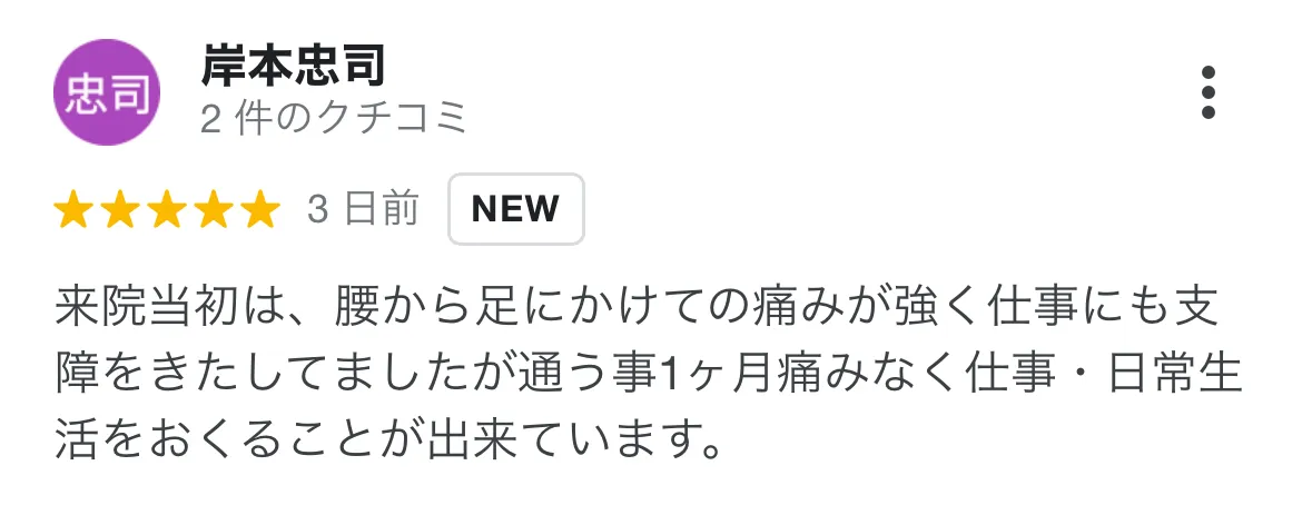 整形外科に通い、安静にしていましたが、なかなか治らず悩んでいました。心身堂さんはカウンセリングや施術も丁寧にしていただき、日常生活での注意点なども教えていただきました。 痛みも解消していて、厳しかった買い物にも行けるようになりました!本当に感謝しています!