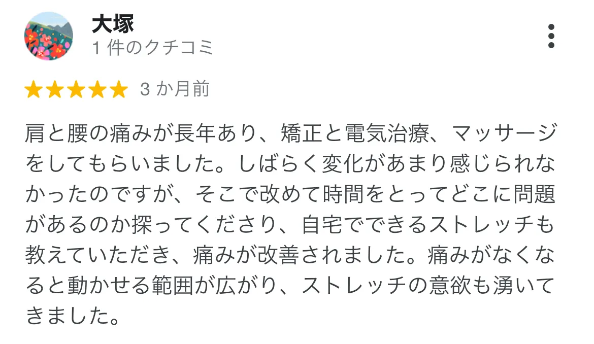 強い腰の痛みとギックリ腰で心身堂さんにお世話になりました。はじめて姿勢写真を取って説明していただき、なぜ痛みが繰り返すのかを教えてもらいました。 今はギックリ腰が改善してきたので、外反母趾や肩首の治療をしてもらっています。
