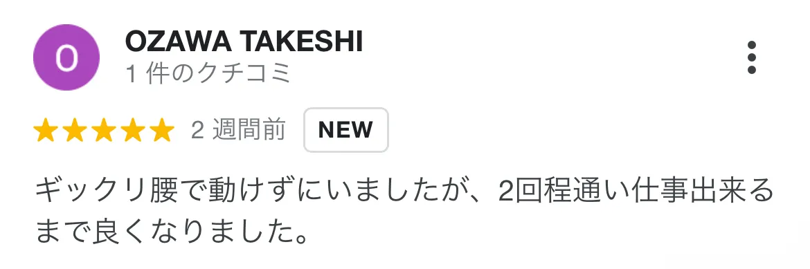 仕事が出来ないほどの激痛が走ってしまい、整形外科などにも通院していましたが、なかなか改善されず、心身堂さんに伺いました。びっくりするほど早く改善して、痛みゼロ!本当にありがとうございます。