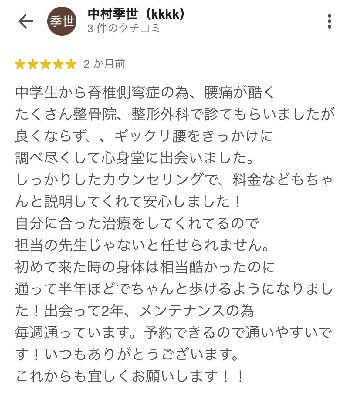 ぎっくり腰になってしまい心身堂さんに伺いました。とても分かりやすく原因を説明していただき、丁寧に施術で改善しました。日常生活での注意点なども細かく教えていただけ、感謝感謝です!
