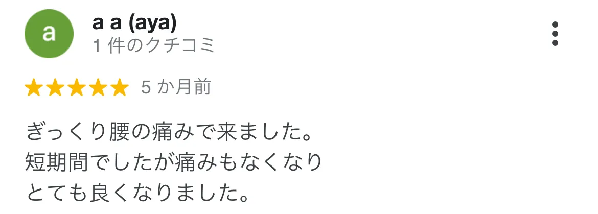 ぎっくり腰でお世話になりました。皆さんすごくやさしく、説明もわかりやすく、丁寧な施術をしていただきました。骨盤と姿勢の矯正をしていただいたので、ぎっくり腰どころか、姿勢まで改善しちゃいました!