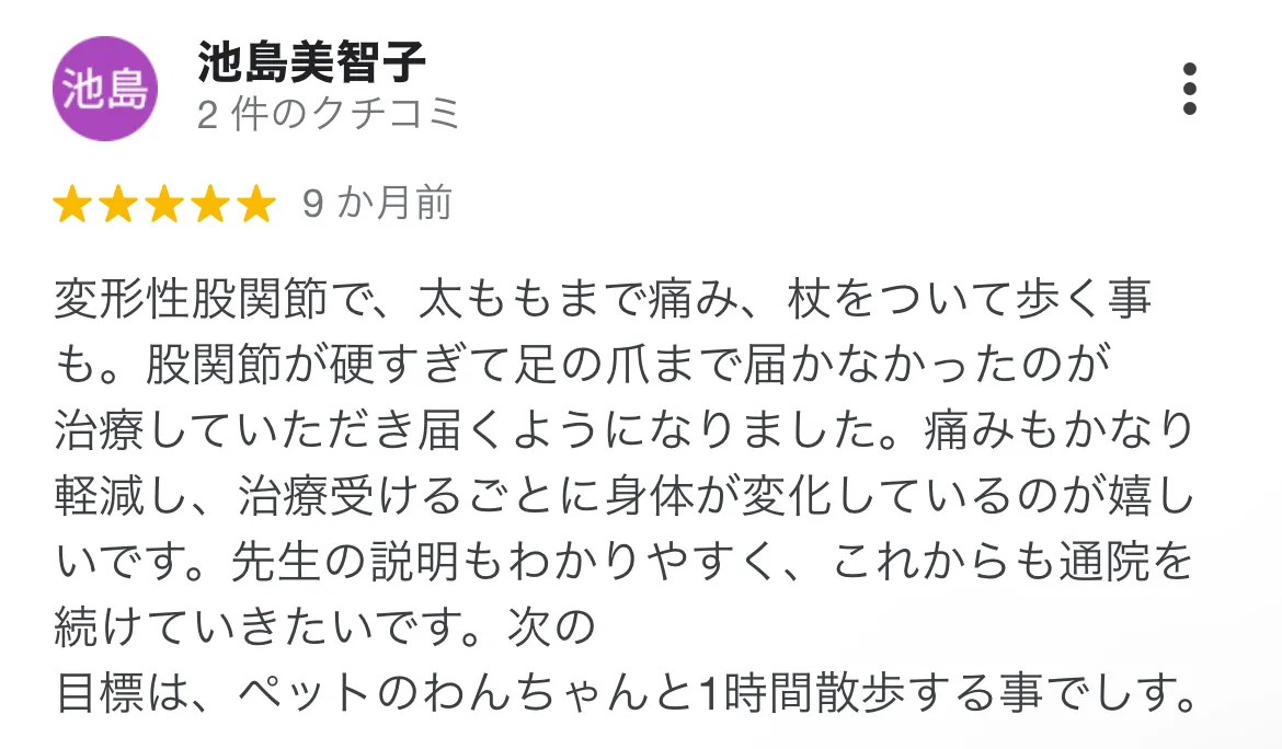 ウォーキングやフラダンスの後の股関節痛に悩まされていました。自分でストレッチをしてみたりしても改善されず、ネットで検索して心身堂さんに出会いました。 根本的な原因に対する施術で、痛みはなくなりました。また、たまに痛みが出てしまった時も、教えていただいたストレッチ法ですぐに治せるようになりました。