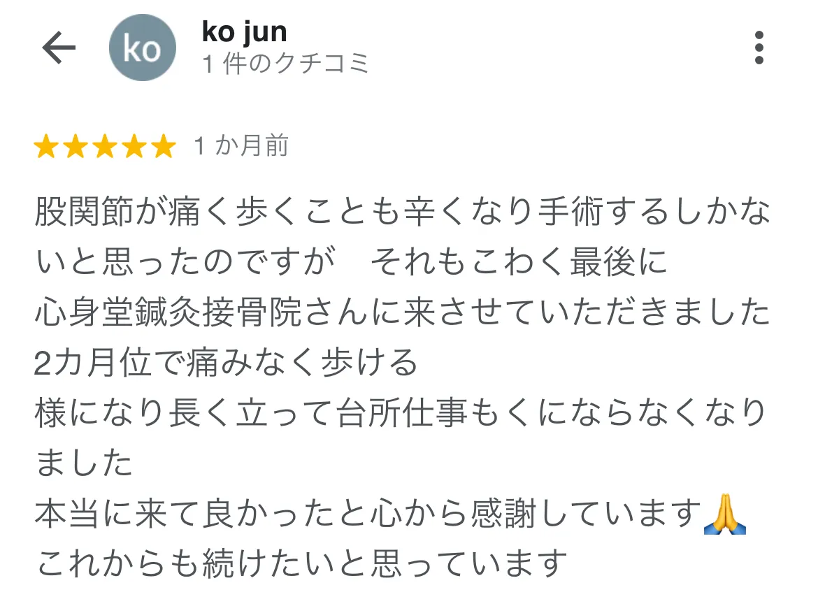 右脚の付け根が非常に痛くて、歩行困難な状態でした。整形外科では変形性股関節症と言われ、手術しかないと言われてました。 藁にもすがる思いで、心身堂さんに伺い、本当にありがたいことにかつての激痛が嘘のように改善しました。本当にホッとしています。