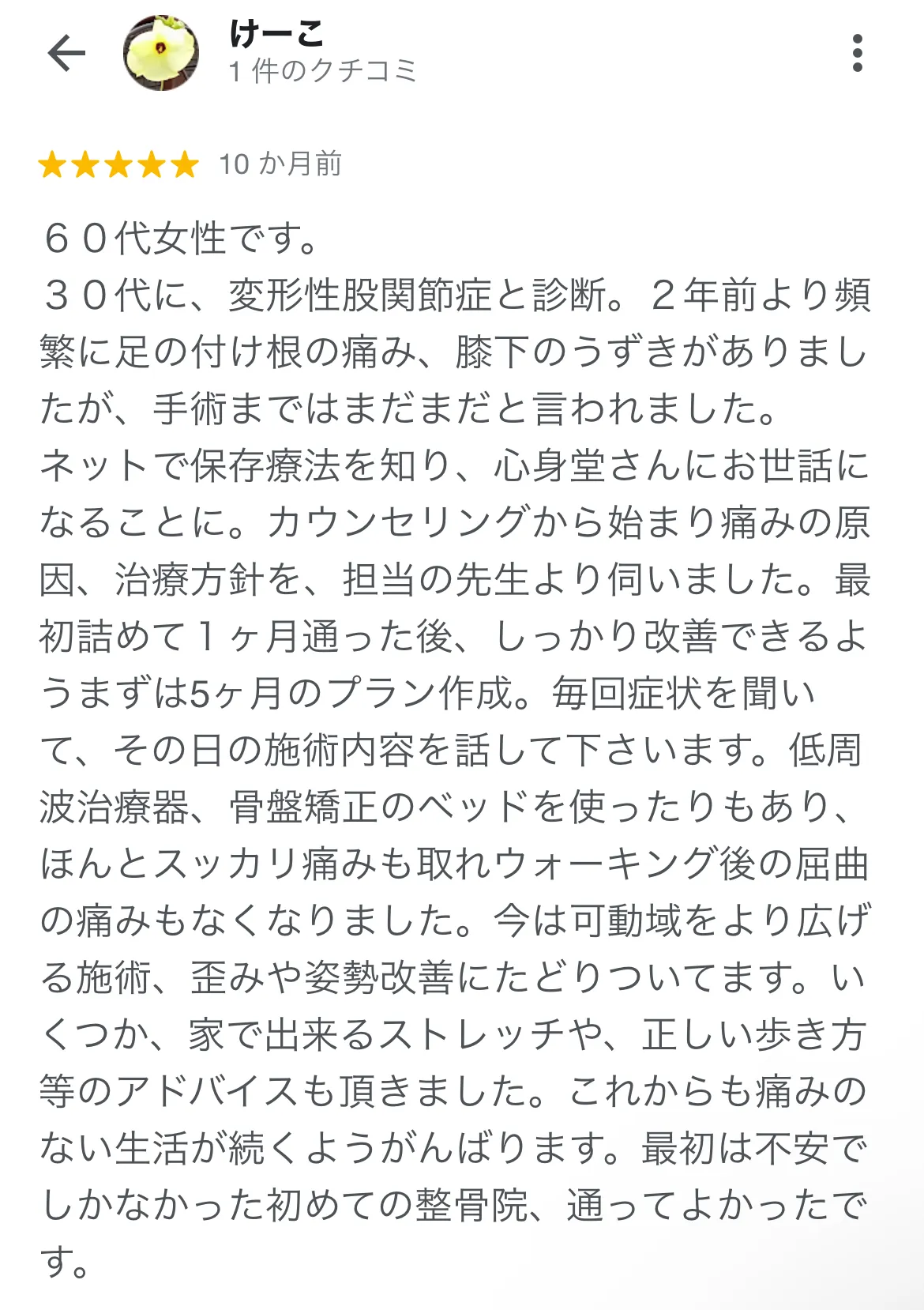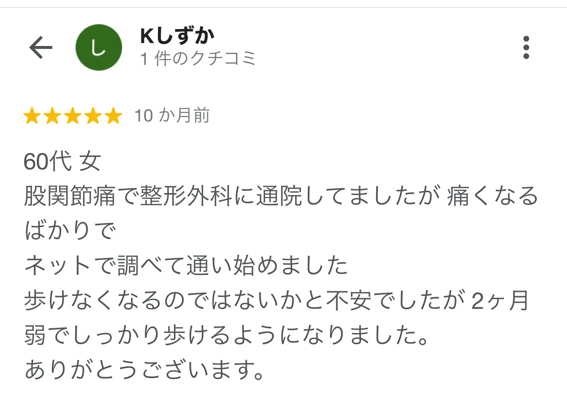 仕事上カラダを動かさないといけず、階段をのぼるだけで痛む股関節のストレスで悩んでいました。心身堂さんは丁寧なカウンセリング、施術をしてくださり、痛みを全く感じないレベルまで改善しました。 素敵な先生たちと出会えて本当に良かったです!