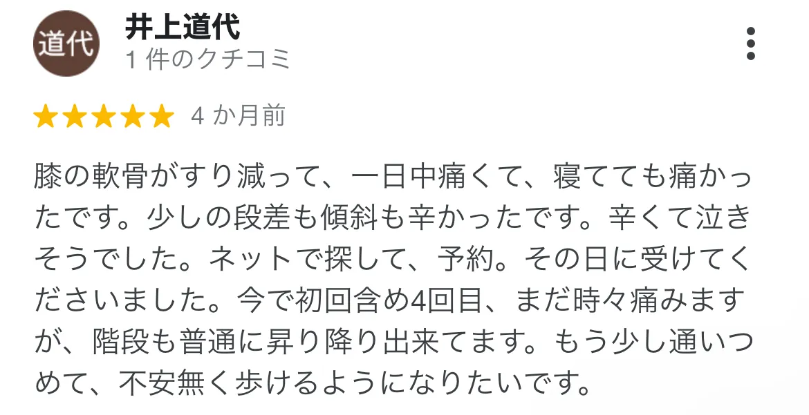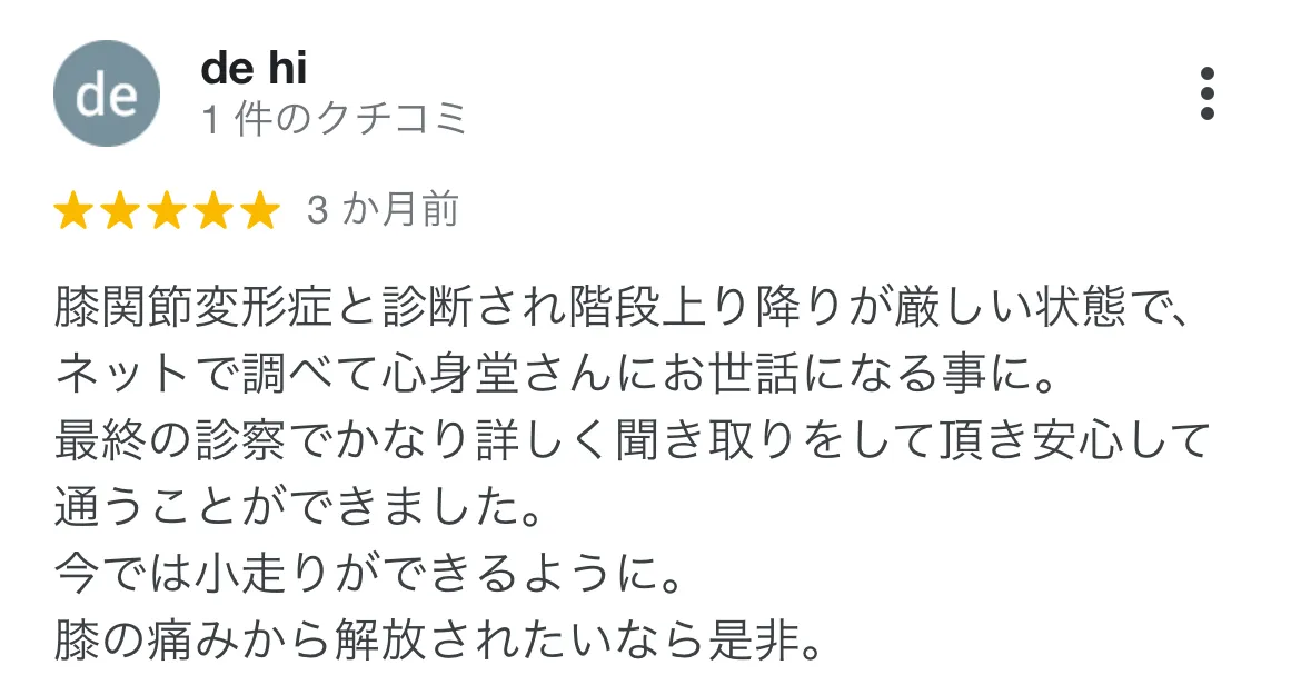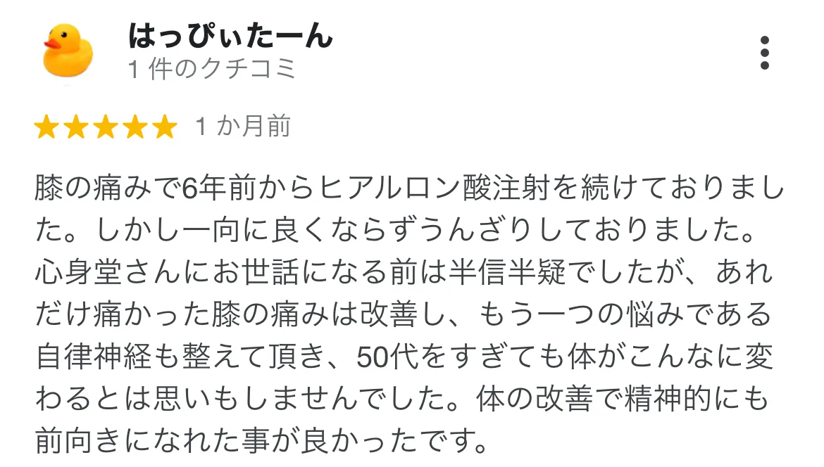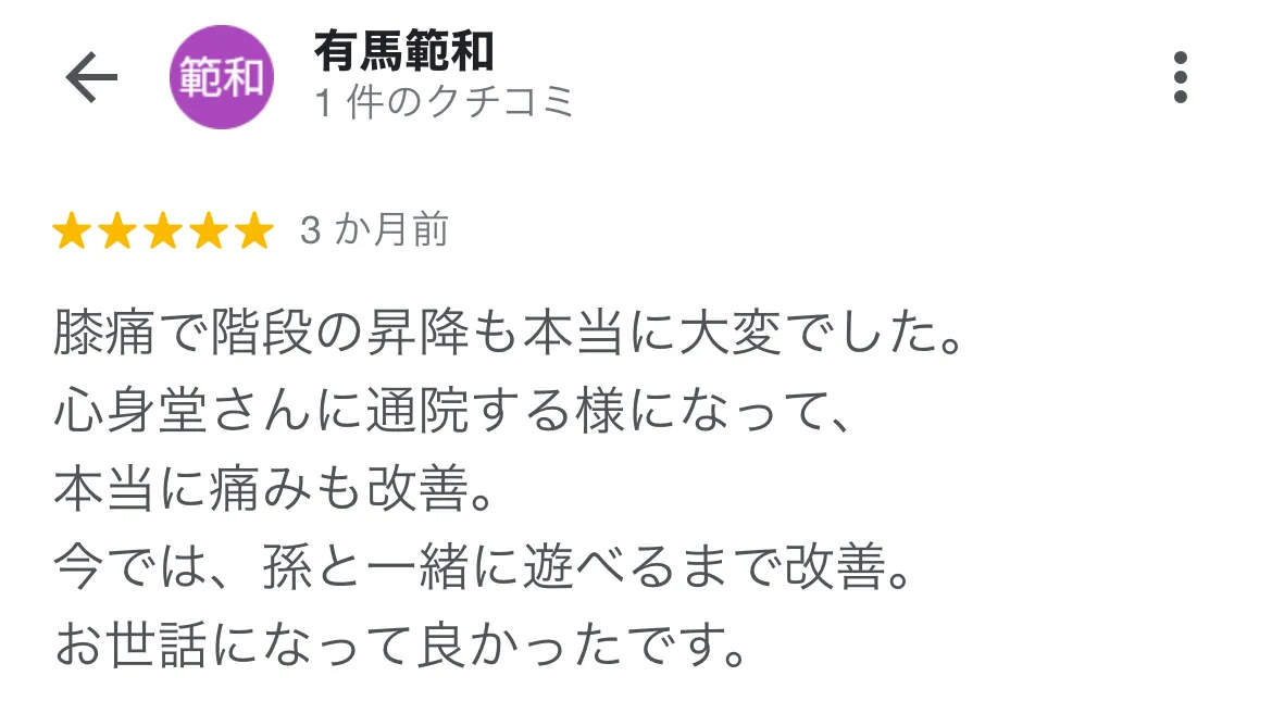 心身堂さんに通う前は、ひざ痛がひどくて歩行がしづらい状況でした。今となってはひざの痛みをすっかり忘れてしまうほど改善され、心も身体もすごく楽になりました。 辛い日々がなくなるので、ぜひ一度来院してみて下さい。