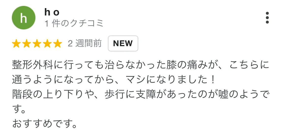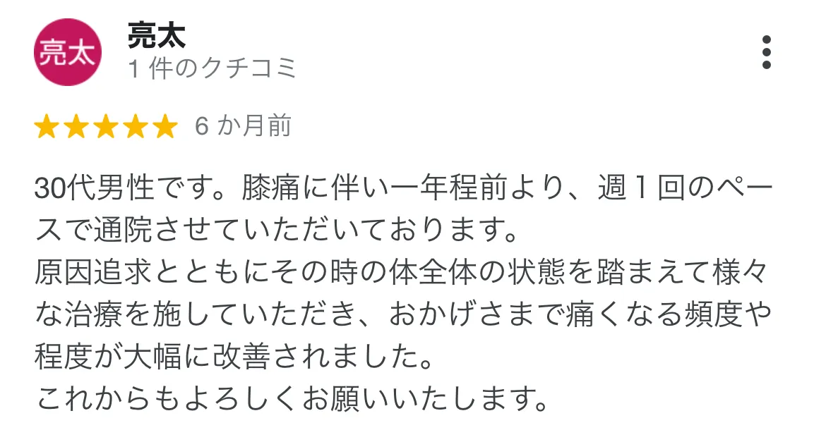 ひざ・股関節の痛みでお世話になりました。親身に相談にのってくださり、色々な施術方法を提案してくださいます。 実際に背面と股関節矯正、股関節周りの筋肉をほぐしていただき、痛みはやわらぎ非常に動きやすくなりました。 今辛いと感じられている方は気軽に相談してみて下さい。